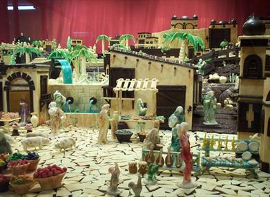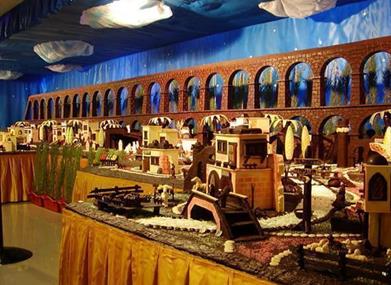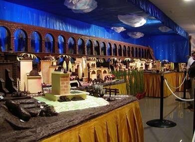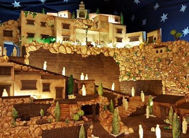 This chocolate nativity scene is surprising not only because of its size but also the type of figures: streets, fountains, religious nativity scene, Christmas scenes, monuments…