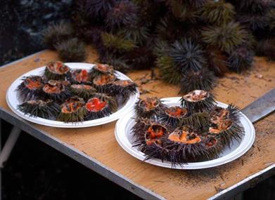 The sea urchin is covered with barbed seafood. It is opened with a knife and eated raw. Only its red meat is used, what should be done with great care not to take a pick. Its flavor is intense and delicious.
